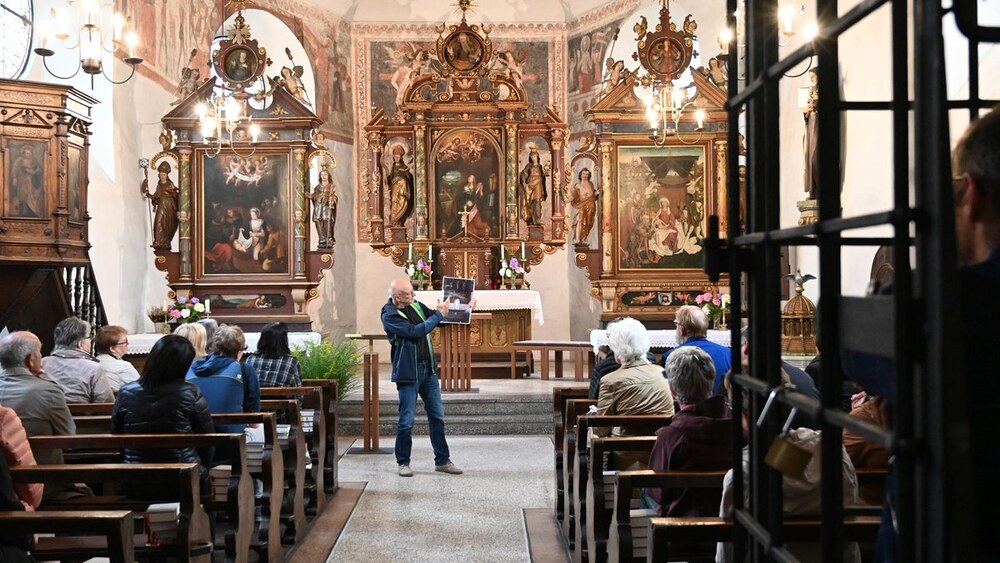 Aber noch ist man ja gar nicht drinnen im Kirchenraum. Einmal wandert der Blick noch nach oben und trifft dort, ganz unerwartet, auf Fresken, die so um 1320 entstanden sind. Da ist ein Christophorus mit dem kleinen Jesus am Arm, da ist eine wunderschön gestaltete Maria mit dem Neugeborenen und da reiten die drei Könige auf ihren Pferden daher, bei denen sich der Maler nicht ganz zwischen Ross oder Kamel entscheiden wollte. Ganz am äußeren linken Rand findet sich in Andeutungen noch ein Lazarus, der soeben erweckt worden wäre. Und damit schließt sich die thematische Klammer auch wieder hin zum Siechenhaus nebenan. „Wichtig war auch der Christophorus. Denn früher glaubte man, dass man an dem Tag, an dem man einen Christophorus gesehen hat, nicht sterben wird“, erklärt Werner Gerold das künstlerische Außenprogramm des Kirchengebäudes. Schon seit je her zogen hier Reisende, Händler und vielerlei anderes Volk vorbei. Es war also wichtig, dass der Christophorus gut sichtbar für alle außen an der Kirche über die Vorbeireisenden wachte. „Das sieht man so immer wieder bei ganz alten Kirchen“, fährt Werner Gerold fort. Und ja, jetzt, wo er es erwähnt, erinnert man sich doch an einige derartige Wächter an den Straßen.