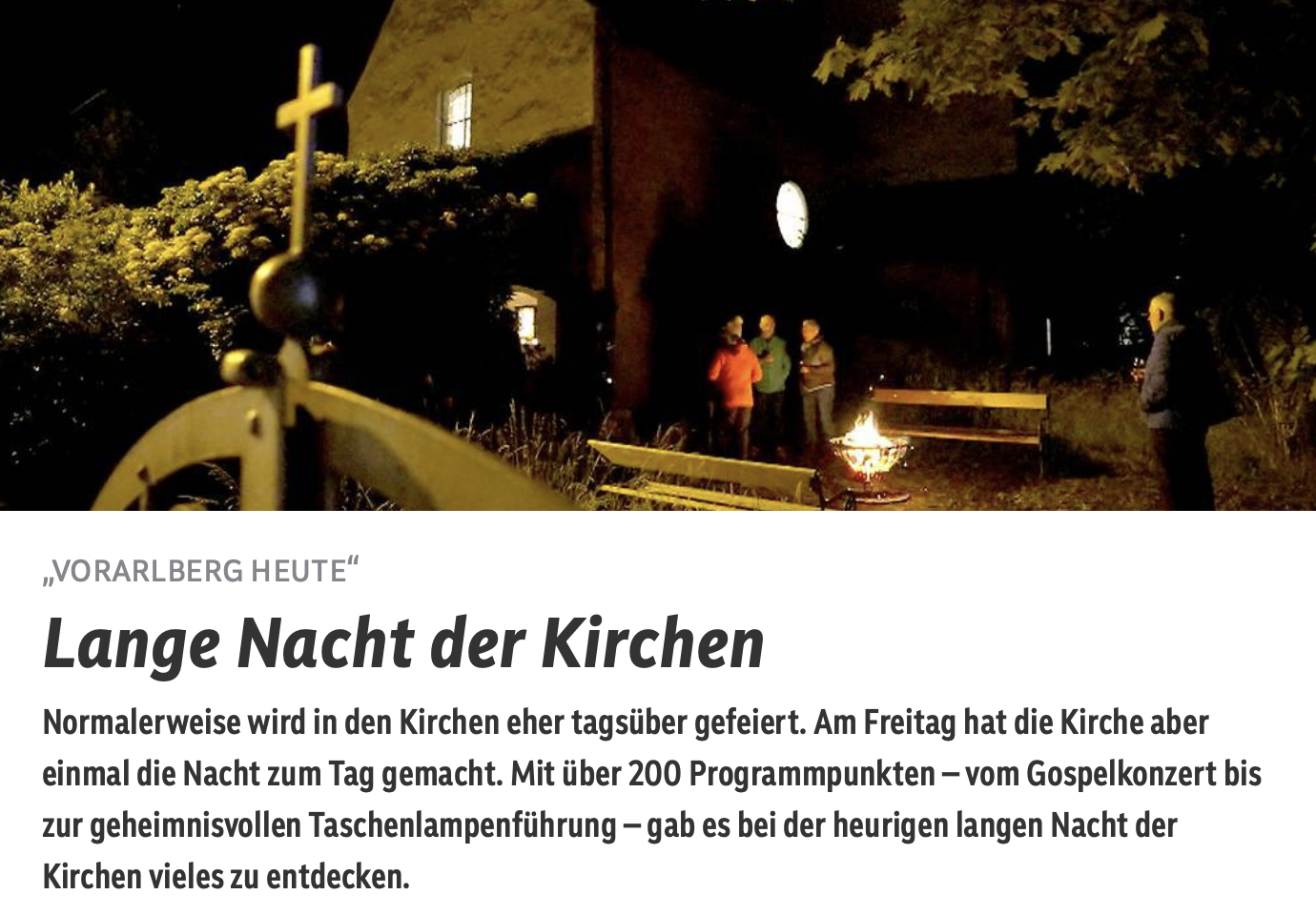 Auch in unserer Pfarre fand ein besonderer Abend statt: im Rahmen der Langen Nacht der Kirchen öffneten wir die Türen der St. Magdalena Kirche, das Kleinod an der Reichsstraße und ließen es in besonderem Licht erstrahlen: Werner Gerold zeigte uns mit seiner Taschenlampe die besonderen Schätze der alten Levner Kirche. Bei seiner geheimnisvollen, fesselnden Kirchenführung erfuhren wie mehr über die rund 700 Jahre alte Geschichte des Gotteshauses. Etliche interessierte Besucher waren unserer Einladung gefolgt, füllten die Kirchenbänke und ließen den Abend im Kirchgarten ausklingen. Das Programm hatte sogar den ORF neugierig gemacht. Ein Kamerateam war vor Ort und berichtete am nächsten Tag in Vorarlberg Heute.