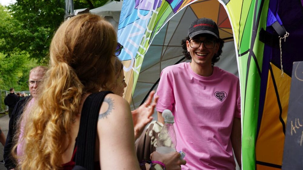 Als sich am Donnerstagmorgen um 10 Uhr die Pforten zum Festivalcamping öffneten, schüttete es wie aus Eimern. Da hilft alles nichts: Festivalbändchen holen und auf ins Abenteuerland. Nach einem kurzen Check-in mit Matthias, dem Koordinator der Sicherheitskräfte war unser 5-Köpfiges Festivalseelsorgeteam (erkennbar am Cap mit Kreuz und am rosafarbenen Tshirt) einsatzbereit. Auch die Hackschnitzel die die PopUpChurch der Jungen Kirche auf trockenen Boden betteten waren schnell organisiert und somit war das Projekt voll auf Kurs.